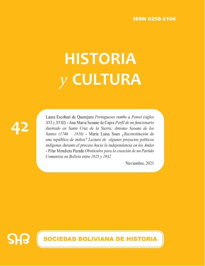 Núm. 42 (2021)El número 42 de la revista Historia y Cultura de la Sociedad Boliviana de Historia presenta los artículos de Laura Escobari de Querejazu, Ana María Seoane de Capra, María Luisa Soux y Pilar Mendieta Parada.