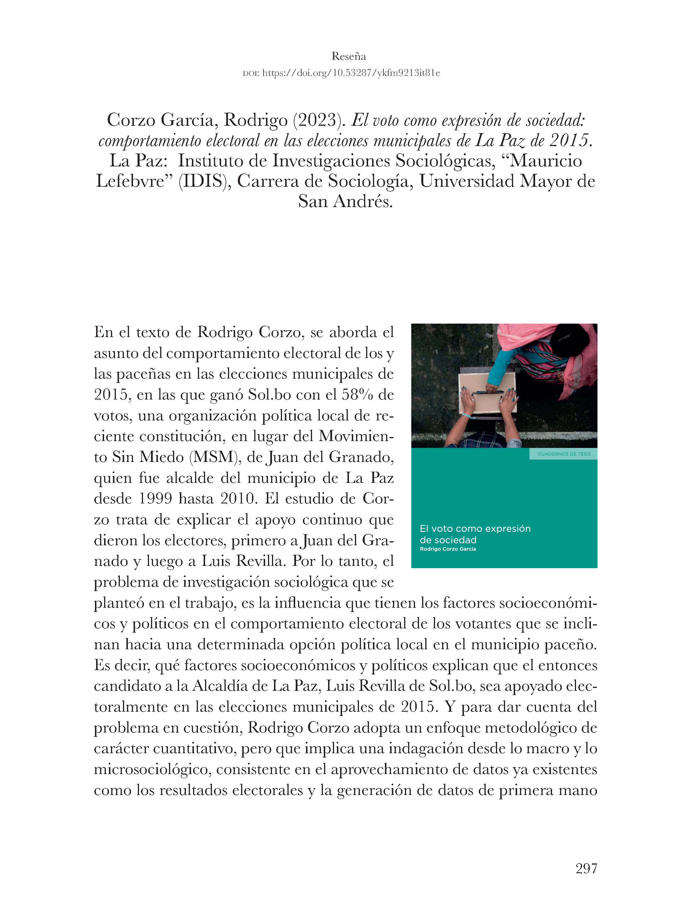 El voto como expresión de sociedad: comportamiento electoral en las elecciones municipales de La Paz de 2015, de Rodrigo Corzo García